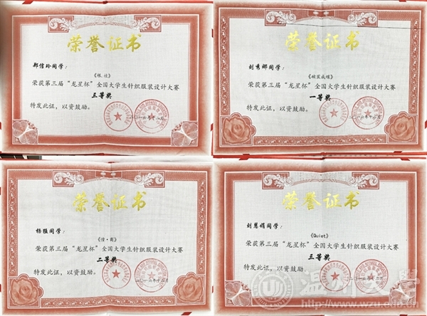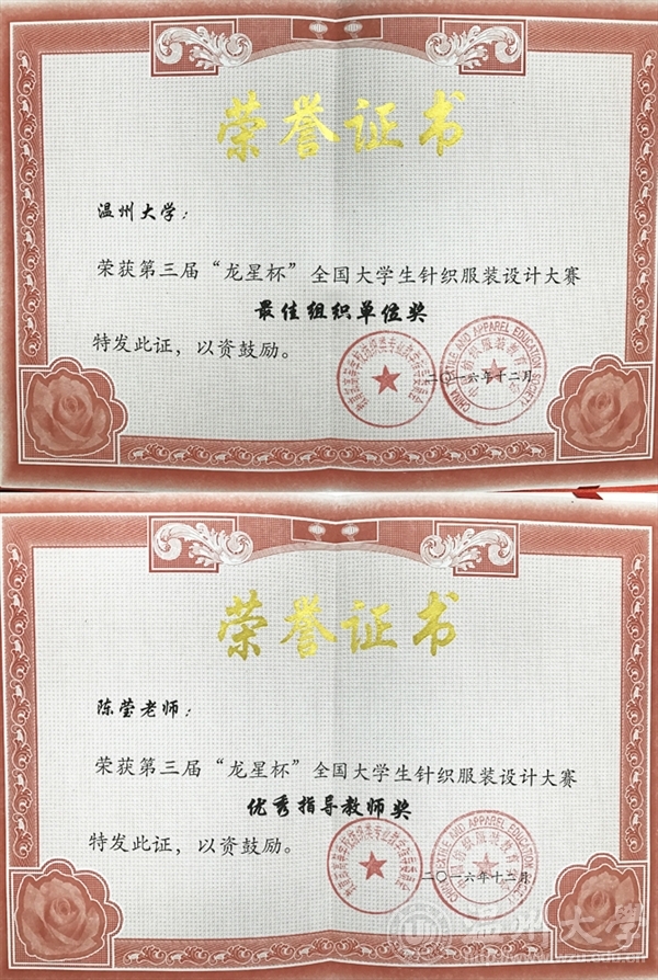 2016年12月30日,由教育部高等学校纺织类专业教学指导委员会和中国纺织服装教育学会主办的第三届“龙星杯”全国大学生针织服装设计大赛,颁奖典礼在东华大学举行。我院服装专业学子在赛事中斩获包括一、二等奖在内的六个奖项,雷竞技raybet官网入口获优秀组织奖,陈莹老师获优秀指导教师。
