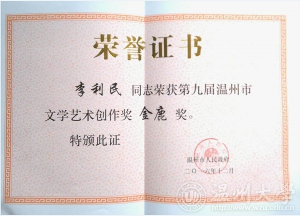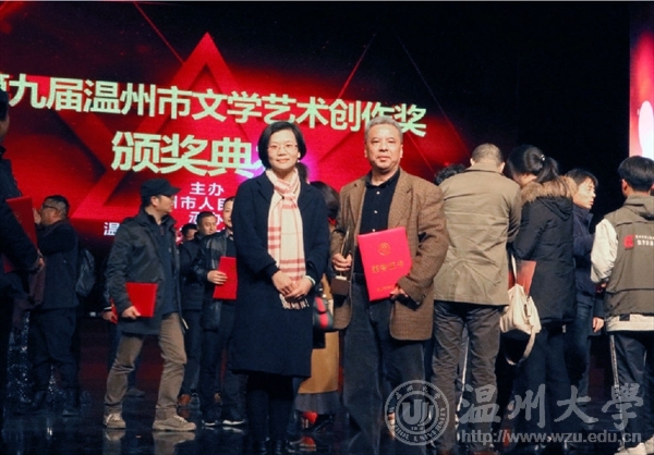 2016年12月29日下午,由温州市人民政府主办,温州市文学艺术界联合会承办的第九届温州市文学艺术创作奖颁奖典礼在温州市工人文化宫成功举办。雷竞技raybet官网入口李利民老师荣获金鹿奖,该奖项是温州市政府设立的文艺最高奖,每三年评选一次,温州市委常委、宣传部长胡剑谨,温州市副市长郑朝阳出席颁奖典礼并给金鹿奖获得者颁奖。