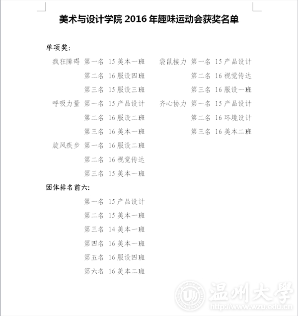 10月15日下午,我院一年一度的趣味运动会在南校体育馆举行,由本科生和研究生组成的17只队伍参加了比赛。 在此次趣味运动会中,共有5个活动项目:疯狂障碍、袋鼠接力、呼吸力量、齐心协力、旋风疾步。同学们兴致盎然,在袋鼠接力、齐心协力中大家玩得不亦乐乎,疯狂障碍、旋风疾步、呼吸力量项目的比赛异常激烈,参赛队员一个个精神抖擞,队友们也在一旁加油鼓励,场面十分热闹。整个运动会既充满趣味性,又充满挑战性,工作人员追踪记录着比赛进程,拍下了各个精彩的瞬间。 同学们在运动中卸掉了学习的压力,散发着青春和活力。在轻松愉悦又不乏激烈刺激的氛围中,身体得到锻炼、心情得到放松。同时,也增进了相互之间的友谊和了解。 附件:趣味远动会获奖名单 文:李江萍 图:王姝洁 孙辈辈