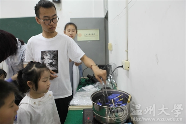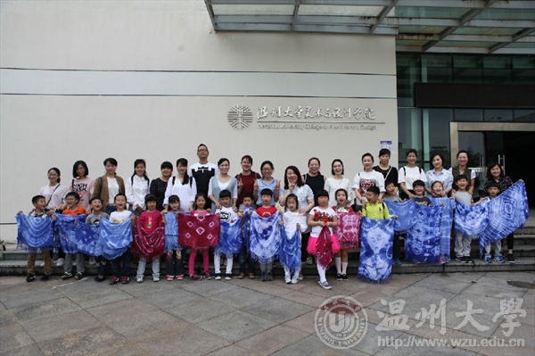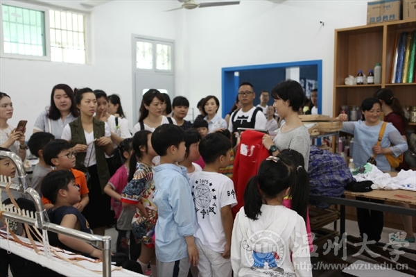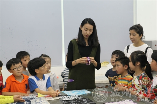 杨老师向大家介绍了雷竞技raybet官网入口美术学院印染实验室。张老师向家长孩子们介绍了“扎染”的发展历史,展示了五颜六色的扎染成品。孩子们都全神贯注的看着,还积极的向老师询问扎染的方法。扎染古称扎缬、绞缬、夹缬和染缬,是中国民间传统而独特的染色工艺。 其工艺特点是用线在被印染的织物打绞成结后,再进行印染,然后把打绞成结的线拆除的一种印染技术。它晕色丰富,变化自然,趣味无穷。更使人惊奇的是扎结每种花,即使有成千上万朵,染出后却不会有相同的出现。这种独特的艺术效果,是机械印染工艺难以达到的。
