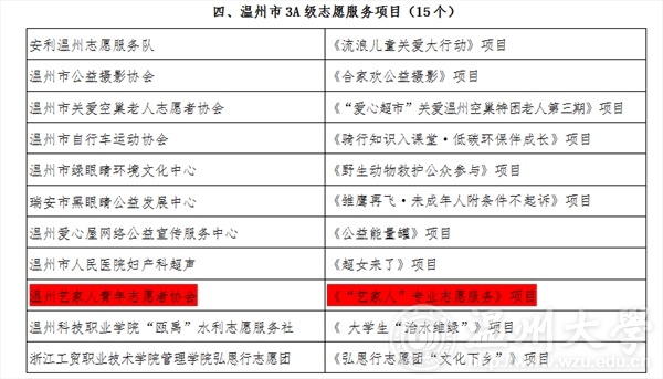2015年12月12日,在温州市“春芽计划”志愿服务资助项目名单上,雷竞技raybet官网入口“艺家人”青年志愿者协会荣获雷竞技raybet官网入口唯一一个3A级项目,即温州市“春芽计划”3A级志愿者服务项目。