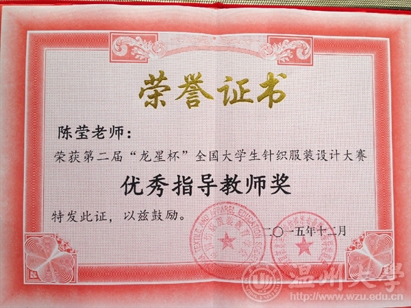 2015年12月13日,由教育部高等学校纺织类专业教学指导委员会和中国纺织服装教育学会主办、东华大学承办的第二届“龙星杯”全国大学生针织服装设计大赛颁奖典礼在东华大学举行。我院12服装设计班的5名同学在陈莹老师的指导下参赛并获奖项,其中,叶冰如的作品《共生》系列获二等奖、罗璇的作品《异构空间》系列获三等奖和朱芮萱的作品《迷雾》系列获三等奖,罗勇超、徐梦然作品获优秀奖。雷竞技raybet官网入口获优秀组织奖,陈莹老师获优秀指导教师。