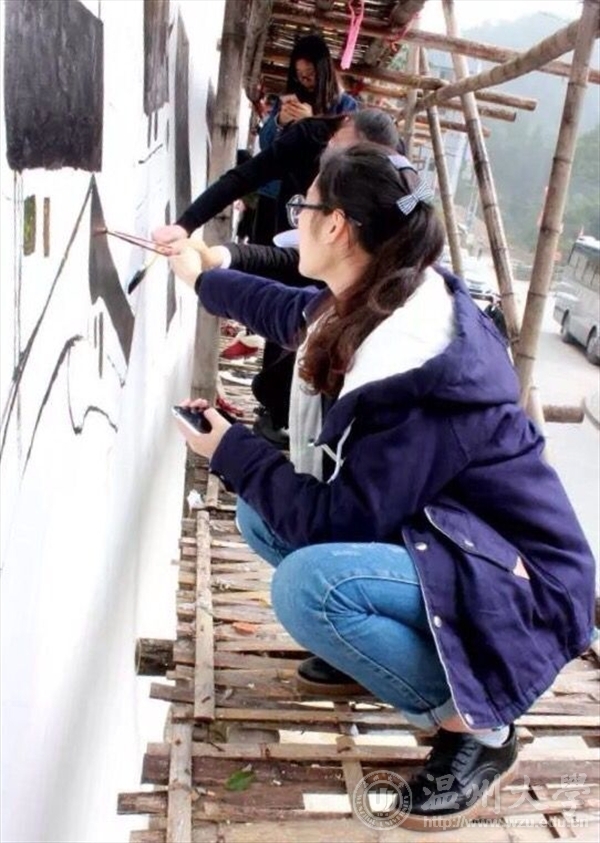 为了响应与落实市委“新青年下乡”主题精神。2015年12月12日,雷竞技raybet官网入口“艺家人”青年志愿者协会带领美术学院志愿者们来到温州市乐清城东街道珠垟村,进行了为期一天的墙绘活动。 冬日的清晨伊始,乐清珠垟村在晨曦之中迎来了一批温大学子,在三米左右的高墙面前,他们不畏艰险,不畏高空,不畏寒冷,在一百九十平米的白墙上画下珠垟村的一草一木。 在墙绘过程中,我院杨振海书记和辅导员叶筱卉老师前来慰问志愿者们,关心活动进展。离开时,杨书记再三强调志愿者们要以安全为主,保质保量的完成墙绘活动,志愿者小伙伴们在墙绘过程中谨记杨书记的叮嘱,在互帮互助,齐心协力下,完成了这次规模较大的墙绘活动。 本次“新青年下乡”墙绘活动,我们主要是运用专业知识与技能去服务社会,真正做到专业与实践相结合,使我们融入到社会中去,为社会奉献出自己的一份力量;另一方面,不仅让我们有机会了解农村、服务农村,还让我们在基层学到了很多课堂上学不到的知识技能。 通过开展各种与专业相关的志愿活动,使大学生在奉献中学习知识,在服务中增加才干。我院“艺家人”青年志愿者不会停下脚步,会继续深化社会主义核心价值观,引导广大青年朝着实现中华名族伟大复兴的中国梦而奋勇迈进! 文字:林伊如 拍摄:林伊如