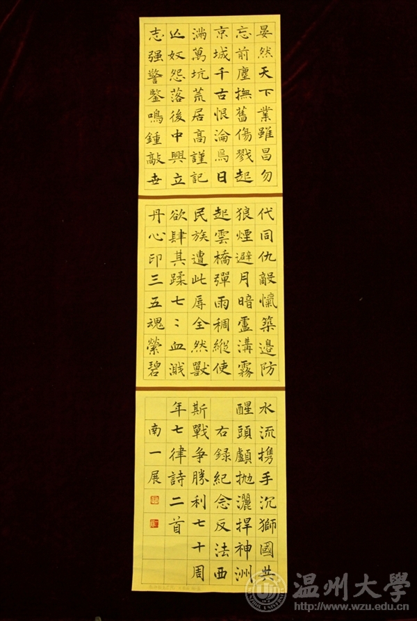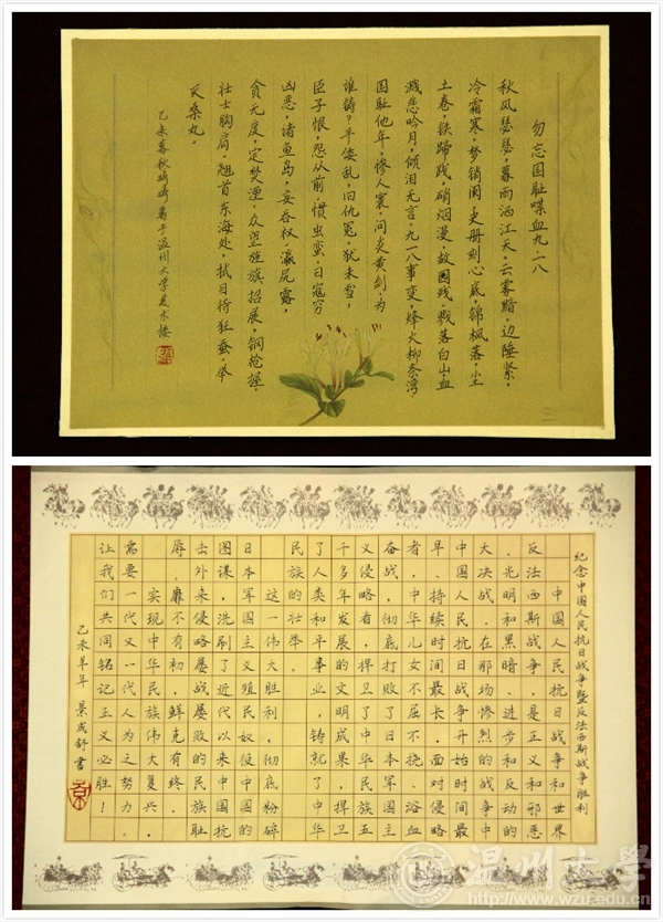 为纪念中国人民抗日战争暨世界反法西斯战争胜利70周年,传承爱国主义精神,弘扬社会主义核心价值观,激发民族自尊心、自信心和自豪感。自9月份发出通知以来,“纪念中国人民抗日战争暨世界反法西斯战争胜利70周年”书画大赛共收到特邀教职工书画作品共计29件,学生书画作品共计196件,经相关书画专家对学生绘画类和书法(篆刻)类作品严格评审,现将评比结果公布如下:?xml:namespace>绘画类评选结果 等级学院作品名作者一等雷竞技raybet官网入口《奇袭》林盖月城市学院《“70”伟大的胜利》李文静二等雷竞技raybet官网入口《忆团结》范桂梅雷竞技raybet官网入口《峥嵘岁月》吴晓强教师教育学院《前行》薛思思城市学院《让武器成为过去》谢丽娟城市学院《爱和平铭记历史》许朵瓯江学院《黑夜不再来》赵圣益三等雷竞技raybet官网入口《抗日中的小八路》陈婉茹雷竞技raybet官网入口《抗日中的中国士兵》胡淳雅雷竞技raybet官网入口《战后》郑也教师教育学院《珍爱和平》李林真城市学院《抗战胜利70周年》王斯曼城市学院《缅怀》张烨瓯江学院无题吴诗瑶瓯江学院无题曾东瓯江学院无题虞紫伊 书法类评选结果等级学院类别作者一等雷竞技raybet官网入口篆刻俞铭铖教师教育学院软笔南一展城市学院管理分院软笔史涛霞二等瓯江学院硬笔曾越洋城市学院管理分院软笔鲁洁如教师教育学院硬笔毛江月教师教育学院硬笔叶聪聪城市学院软笔王欢焕城市学院软笔葛科航三等雷竞技raybet官网入口硬笔王婷婷雷竞技raybet官网入口软笔杨凡雷竞技raybet官网入口软笔朱雄辉雷竞技raybet官网入口软笔岳通通雷竞技raybet官网入口硬笔景成舒教师教育学院硬笔陈雪雅教师教育学院硬笔吴林教师教育学院硬笔林安娜人文学院硬笔周丽娜 书画展于南校区雷竞技raybet官网入口服装楼一楼视野空间展览,展期为12月7日—12日,欢迎参观!特邀教职工参与展览作品: 学生获奖作品:一、绘画类一等:《奇袭》——林盖月一等:《“70”伟大的胜利》——李文静 二等三等二、书法类一等:《抗战祖列》——俞铭铖一等:纪念反法西斯战争胜利七十周年律诗二首—— 南一展一等:史涛霞二等 三等三等三等
