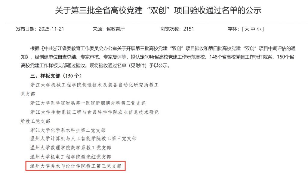 近日,中共浙江省委教育工作委员会发布《关于第三批全省高校党建“双创”项目验收通过名单的公示》,公布了第三批全省高校党建工作示范高校、标杆院系、样板支部验收通过名单。我院教工第三党支部2023年8月确定为第三批全省高校党建“双创”培育创建对象,经过2年创建,顺利通过验收。