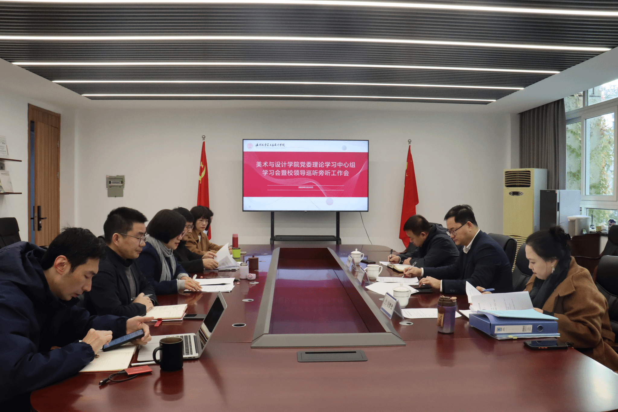 2025年12月30日上午,雷竞技raybet官网入口党委理论学习中心组在学院2B216会议室召开专题学习会,深入学习贯彻党的二十届四中全会精神及新时代思想政治工作相关要求。校领导王军副校长率巡听旁听组全程指导,学院党委理论学习中心组成员出席会议,刘青松主持会议。会上,谢子静院长领学习近平总书记考察广东重要讲话精神及温州市委十三届九次全体(扩大)会议精神。她结合学院实际,从深化系统性改革激发内生动力、以高水平开放拓展发展空间、以高质量育人坚守初心使命三个维度,阐述了学院对接国家战略与地方发展的实践路径,强调要推动艺术与数字科技、人工智能深度融合,助力温州文化强市与生态强市建设。随后,刘青松领学《中国共产党思想政治工作条例》等内容,系统解读了条例出台的时代背景、核心定位与四大核心问题框架,明确了思想政治工作“是什么、谁来做、做什么、怎么做”的关键要义,指出条例为学院开展思想政治工作提供了根本遵循,要切实将其融入教育教学全过程。交流发言环节,中心组成员围绕学习主题,结合分管工作谈认识、讲体会。大家一致认为,要将党的二十届四中全会精神转化为推动学院发展的具体行动,聚焦学科专业优化、人才培养质量提升、产学研融合等重点工作;同时要立足艺术学科特色,创新思想政治工作方法,强化课程思政建设,培育德艺双馨的艺术人才。王军副校长对本次学习会给予充分肯定,认为会议准备充分、研讨深入、联系实际紧密。他结合学院发展现状提出要求,强调要精准谋划“十五五”发展规划,聚焦核心专业发展,集中资源打造特色亮点;要健全制度体系,以科学评价机制激发师生活力;要立足温州产业特色,推动美育与设计高质量协同发展,提升服务地方发展的能力与贡献度。(初审:张珈瑜,复审:黄旭红,终审:刘青松)