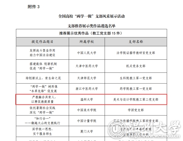 近日,我院教工第二党支部的“产教融合共育人,以赛促教提质量”成果获全国高校“两学一做”支部风采推荐展示优秀作品,全国高校共有15个教工党支部获此荣誉。