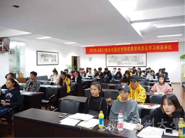 2017年11月3日晚,雷竞技raybet官网入口2016-2017学年优良学风班及学习标兵的评比在2B4001顺利举行。本次评比由学生科李雪涛老师、团委学生会主席陈显楠同学、团委学生会副主席王佩瑜同学、团委学生会副主席王芳园同学以及美院各班班长担任评委。