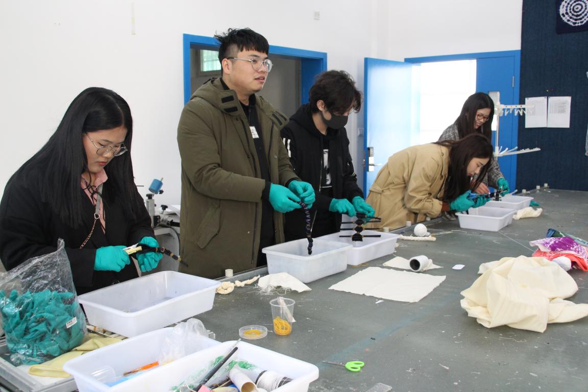 扎染,古称扎缬、绞缬、夹缬和染缬,“秦汉始有之”(工仪实录),它朴实无华又天然成趣,是中国民间传统而独特的手工染色技术之一。独特的手工扎结、染色形成的痕迹美、自然过度的色晕美,是扎染的独特所在,使其具有跨世纪的旺盛艺术生命力。活动开始,负责人带领同学们来到美院服装楼,认真讲解了扎染工艺的文化内涵,介绍了扎染工艺的起源、传承及工艺特色。随后,同学们参观了已完成的扎染作品,零距离感受扎染的艺术魅力。