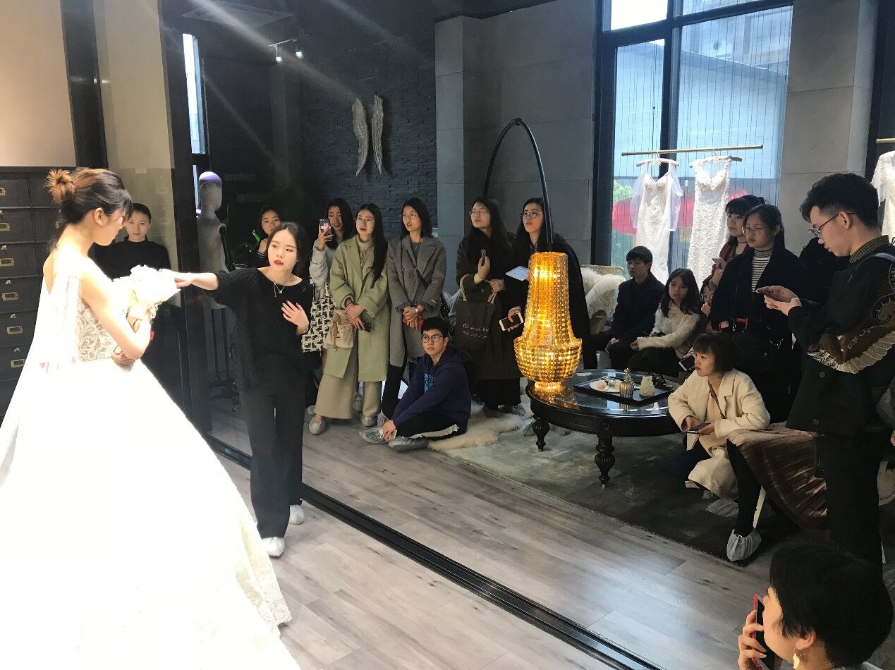 温州市鹿城区五马嫁依工坊婚纱店,是雷竞技raybet官网入口的校企合作定点单位,自2004年创立至今,已与国内外二十多家知名婚纱品牌合作,让臻美的大牌婚纱落地温州,为新娘带来了与国际结轨的尊享体验。此次我们参观的是2016年嫁依工坊新入驻米房开设的玩味定制婚纱体验馆“JOINFINE+”。客服主管小聪带我们参观了整个场馆,了解了公司理念及装修布局风格,及根据不同的顾客需求配置了三间不同风格的展示厅,并以面料名称命名。销售总监精心挑选了目前最新款、最具代表性的五件婚礼服给同学们进行了展示讲解。大家针对礼服的设计、面料、工艺、装饰、色彩、市场定位等专业问题展开了热烈的讨论与交流。