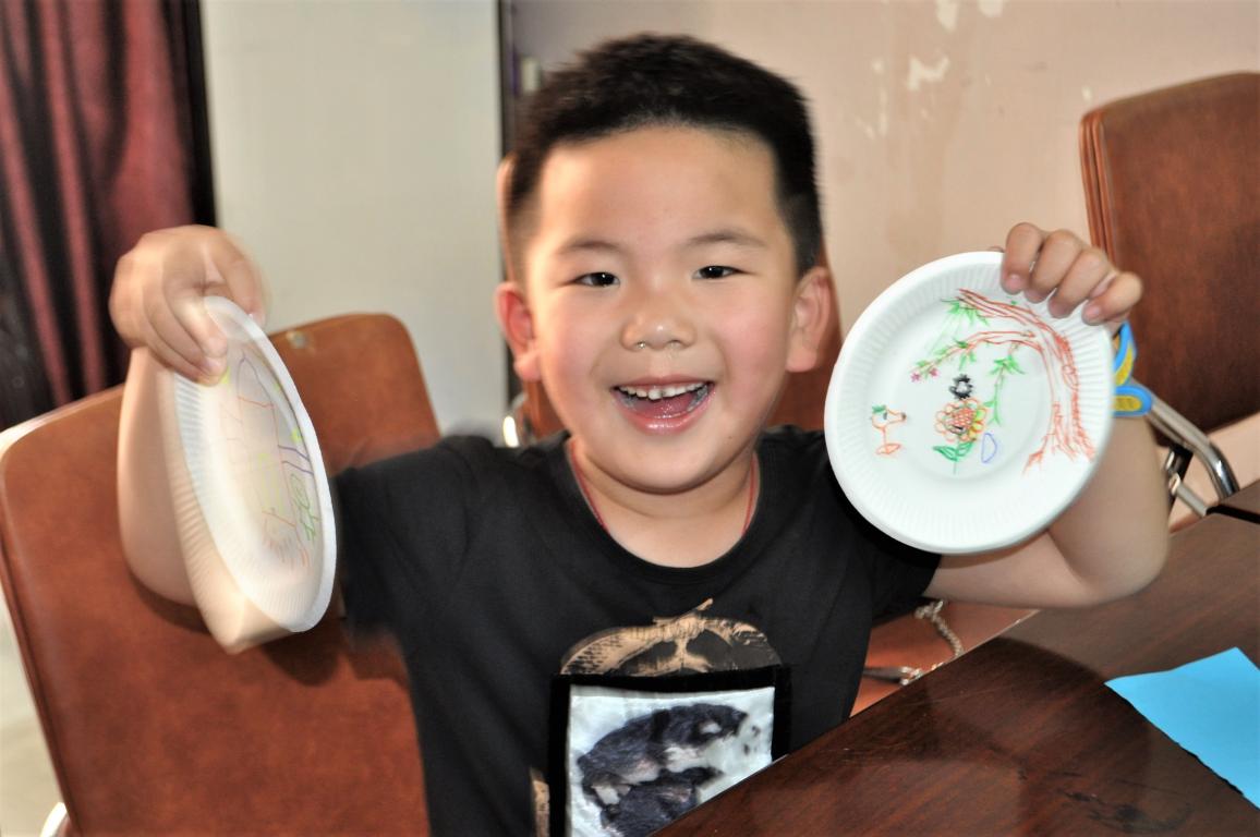 活动刚一开始,小朋友们就按耐不住了,立刻发挥自己丰富的想象力拿起五彩画笔在盘子上作画,有的还拿起剪刀裁出小动物的剪纸图案,不一会儿,通过铅笔的构形,橡皮的修改,颜料的上色等几个步骤,再加上画出的小猫咪,大熊猫,恐龙,蜡笔小新等等五花八门的图案,以及剪出的恐龙的小翅膀,猫咪的小尾巴,大熊猫的耳朵剪纸图案,所有的元素组合在一起,一个个可爱的盘子就呈现在眼前了,使人眼前一亮!纸盘上的小动物似乎富有生命力一样,活泼可爱,摆在桌面上很是讨人喜欢!活动过程中,小朋友们还玩起了石头剪刀布的游戏,不经意间的小动作总会让大家开怀大笑。由笑声开始的活动,又将要在笑声中结束了,最后小朋友们一起拿着自己的作品合影留念。
