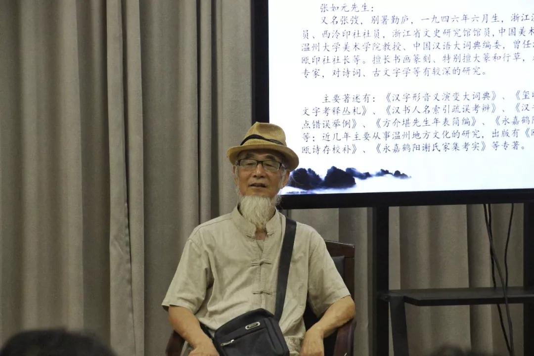 张如元老师曾任温州师范学院美术系主任,温州市书法家协会副主席,东瓯印社社长,中国美术学院书法系客座教授,浙江省文史研究馆馆员,西泠印社社员。他擅长书画篆刻、特别擅大篆和行草,是古文字学领域的著名专家,对诗词、古文字学等有较深的研究。1977年被抽调为国家重点科研项目《汉语大词典》编写,1994年被国家教育部指定为《汉语大词典》审稿定稿人,2002年被聘为《汉字形音义大词典》形系主编,2003年至今都在中国美术学院讲授古文学和书画题跋。退休后受温州博物馆邀请担任学术顾问,2013年被聘为温州县志编写顾问。他的主要著作有《汉字形音义演变大词典》、《玺印文综》、《战国玺印文字考释丛札》等论著;近几年主要从事温州地方文化的研究,出版有《瓯海轶闻校笺》、《东瓯诗存校补》、《永嘉鹤阳谢氏家集考实》等专著,此外还举办了个人书画作品展。张老师在原温师院任教期间严谨治学,桃李满天下,为温州培养了很多优秀的艺术人才。