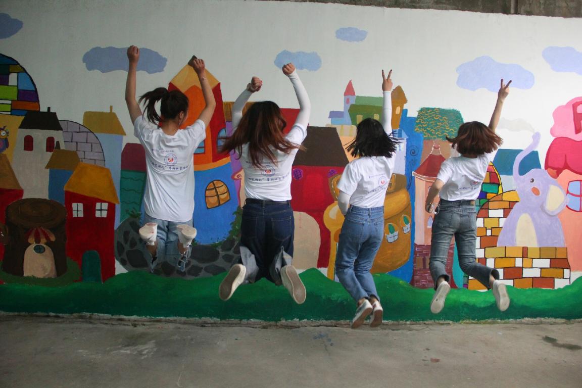 在志愿者活动的途中,小朋友们与我们想象的并不一样,他们也可以与你正常的交流,只是回应稍微缓慢了些。在这几天里面,我们为他们做了手工卡片,小朋友们收到的时候都露出了高兴的表情,他们可能不能正常的交流,但是同样拥有善良无邪的品质。在这几天里,我们接受了学校的委托,首先在最外面墙面上进行绘画,穿过云块的太阳光,就像根根金线,纵横交错,将浅灰蓝的云朵编绘成一幅美丽图案,那阳光也同样映在成员们的身上,滚圆的汗珠在无声的滴落,就像成员们想要传递的爱心那样,虽然没有那么多的言语,但是用实际行动告诉孩子们爱就在身边。