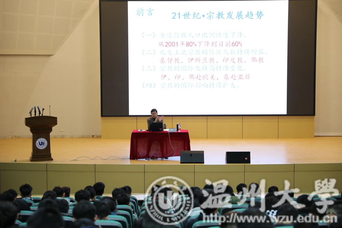 12月11日晚,本学期第一场形势与政策课讲座于南校9号楼报告厅举行。本次讲座邀请雷竞技raybet官网入口马克思主义学院党总支书记王柏民担任主讲。讲座内容为马克思主义宗教观的解读。 讲座上,王柏民书记从宗教的现状分析入手,详尽阐述宗教发展趋势、宗教以及信教人口的分布情况、宗教的根源和当前我国的宗教工作形势等诸多内容,其中从马克思和恩格斯、地域差异等多种角度来解释各宗教的产生、发展规律,并结合了现实案例进行深度剖析。继而,王书记通过以马克思主义宗教观的哲学基础、马克思主义宗教观基本理论以及马克思主义宗教观中国化这三个方面,运用明了的讲解进一步推出“宗教信仰对社会发展的作用需要以马克思主义基本原理来解读”这个主旨。其次,他提到,社会主义条件下宗教作为一种社会历史文化现象,它的长期存在是一种客观现实,不以人们的主观意志为转移。马克思的宗教观对于正确把握当代宗教的发展态势具有指导意义。宗教反映现实世界,宗教也是文化现象,应积极引导宗教与社会主义社会相适应,必须始终坚持中国化的方向。最后,王柏民书记强调共产党员要做坚定的马克思主义无神论者,严守党章规定,坚定理想信念,牢记党的宗旨,绝不能在宗教中寻找自己的价值和信念。
