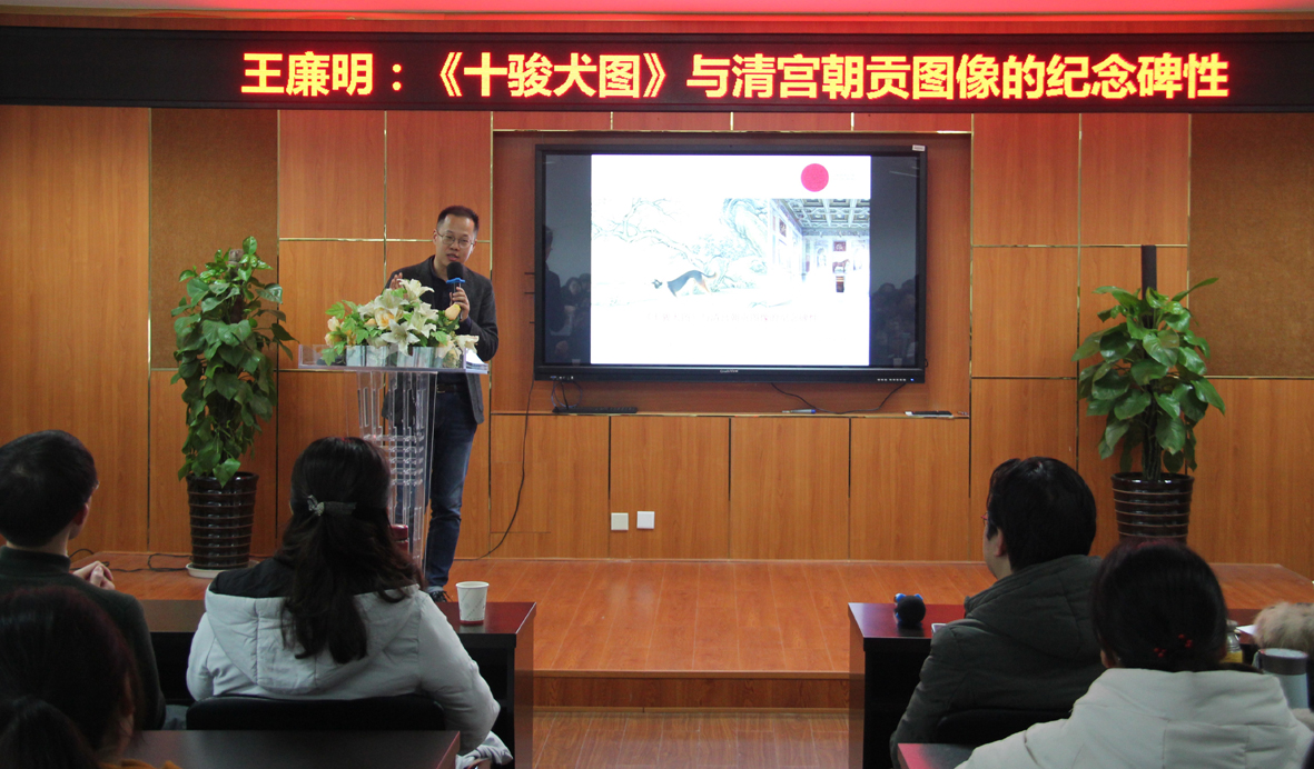 1月3日,德国海德堡大学副教授王廉明老师受邀莅临我院,在农历狗年年终之际深入解析清宫中的猎犬图,为广大师生带来了一场精彩的学术讲座“《十骏犬图》与清宫朝贡图像的纪念碑性”。讲座由我院副院长张晓剑老师主持,美术学系教师、硕士生和本科生近百人到场听讲。 王廉明老师出生于浙江温州,2006年留学欧洲,攻读博士期间师从汉学界研究中国艺术的权威雷德侯教授,现为海德堡大学东亚艺术史研究所副教授、马克斯普朗克艺术史研究所访问研究员(2018-19),主要从事明清艺术史、全球/跨文化艺术史的研究,已出版德文专著2部,编著2部,发表德文、英文、中文论文数十篇。 讲座着眼于一般美术史研究不怎么关注的猎犬图,对北京故宫博物院藏、艾启蒙绘《十骏犬图》册页的制作背景、功能进行了抽丝剥茧般的考察。王廉明老师查阅了大量清宫原始档案,考证了艾启蒙《十骏犬图》的创作时间和具体内容,并比对郎世宁绘《十骏犬》轴以及其它朝贡动物画,发动多方资源重构当时的历史语境,揭示了制作这类画所隐含的政治意义。他指出,这些良犬自春秋时期就已有记载,乾隆皇帝把少数民族和大清的征服者进献来的名犬制作成图像(且多次复制),是要模仿周朝的朝贡关系,将其纳入有关中央和地方朝贡关系的政治叙事中,为大清统治的合法性提供象征性表达。王老师还从观看对象、摆置空间、绘画形制等方面入手,探讨了清宫朝贡动物画的纪念碑性问题,提出了“图像纪念碑”(pictorial monument)的概念。 张晓剑老师在总结中说,西方学界已经大大拓展了艺术史研究的范围,这需要研究者有更敏锐的理论嗅觉、更宽广的视野,王老师用大量一手材料的采掘、扎实细致的考证和别开生面的阐发,为我们示范了当下艺术史研究的方法、趋势和境界。 在交流环节,有同学和老师就图像的政治功能、“纪念碑性”概念的内涵和适用性、乾隆的行乐图等问题向王廉明老师提问,王廉明老师的回答把讲座主题进一步引向深化。