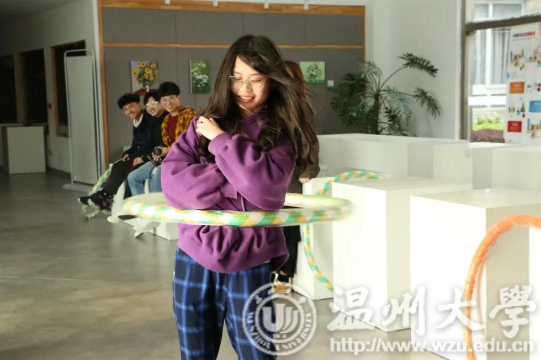赛场周围已被参赛者与观战者团团围绕。参赛者们不约而同得进行赛前热身运动,有的压腿有的拉筋,蓄势待发、跃跃欲试;观战者们在美院楼前的空地上“叽叽喳喳”、七嘴八舌,热情高涨得“打赌”“约定”冠军将花落谁家。比赛开始了,呼啦圈犹如一只小精灵在参赛者身上摇摆、旋转与舞蹈,一圈又一圈,令人眼花缭乱;在空中上下“翻飞”的毽子划出一道道优美的弧线,而参赛者们的脚步也跟着它的轨迹四处蹿跳。大家都激情洋溢,一面挥洒汗水,面露不甘落后的神色;一面拼尽全力,眼中熊熊燃烧着渴望胜利的火焰。随着参赛者的数量越来越多,欢呼声、呐喊声、加油声、鼓舞声此起彼伏,整个美院楼前一派生机与活力。虽然参赛者之间是竞争关系,虽然大家来自不同的班级,学着不同的专业,虽然互相的了解并非充分而贴切,但是此时此刻,在美院楼前,大家都是一家人,一起呐喊、一起“拼命”、一起大笑、一起挥汗,心与心的距离贴得越来越近。