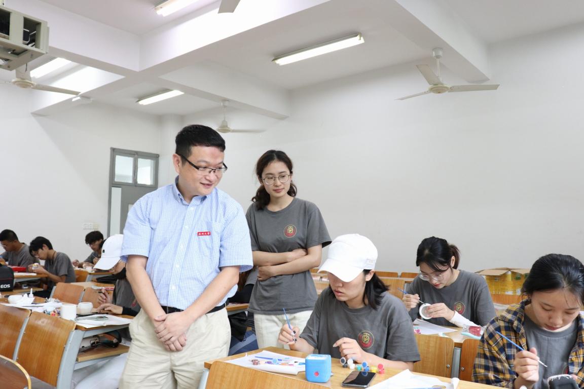 2019年7月19日上午9时许,雷竞技raybet官网入口副院长顾任飞和学生科辅导员张佳慰问了正在美院制作手工义卖品的“魅力工艺”暑期社会实践队。