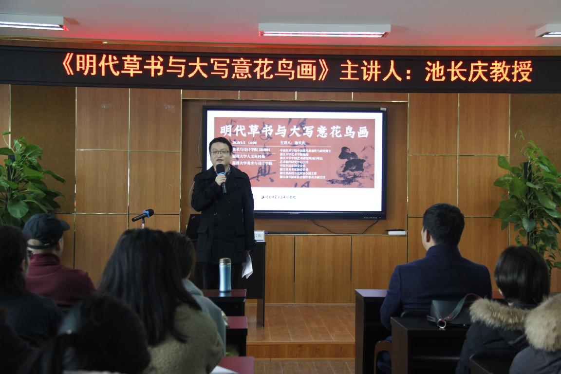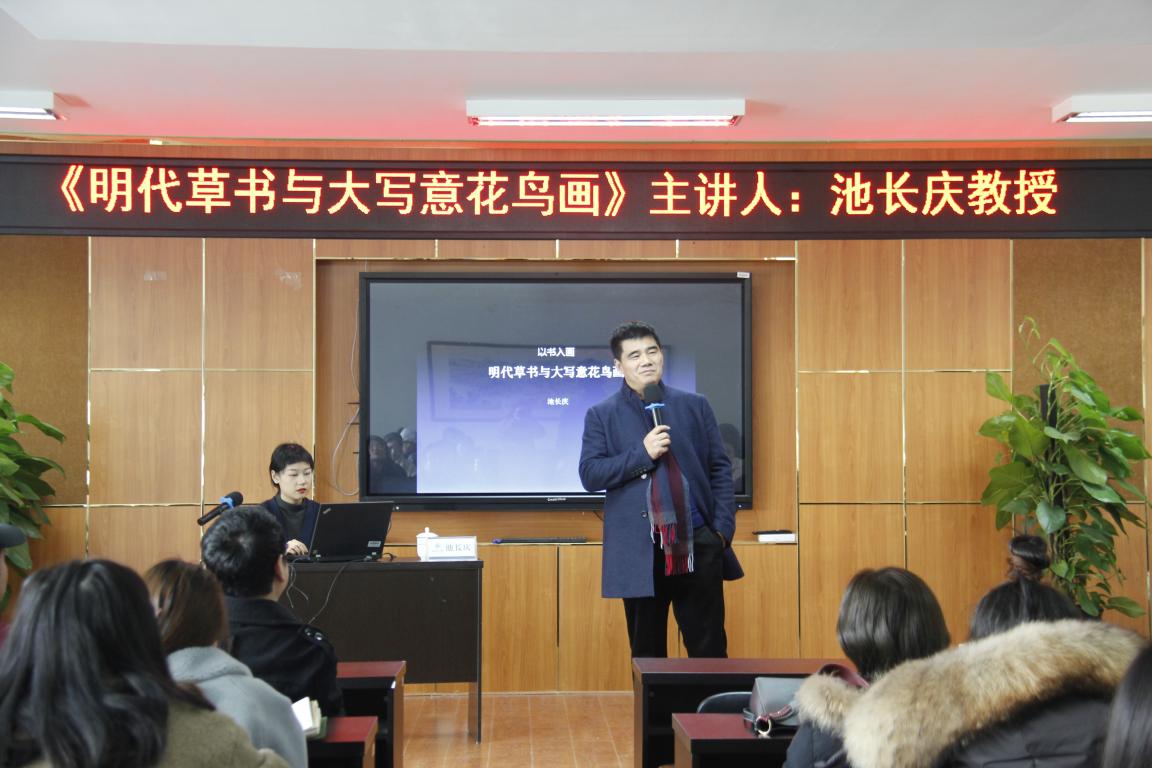 1月2日下午,我院荣幸邀请到浙江大学中国艺术研究所执行所长、艺术创作研究中心主任池长庆教授,为我院师生带来一场题为《明代草书与大写意花鸟画》的讲座。学院院长谢子静、副院长顾任飞、美术系专业老师,研究生、本科生及温州书法爱好者共80多人参加活动,丁海涵副教授担任学术主持。