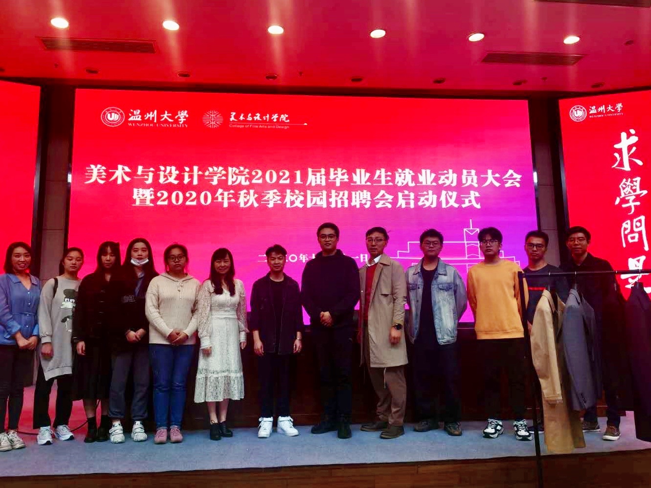 为进一步做好2021届毕业生就业工作,10月21日晚18:30,我院于图书报告厅举行了2021届毕业生就 业动员大暨2020年秋季校园招聘会启动仪式。莅临本次活动的有学院党委副书记杨丽君,东蒙集团技术 委员会主任陈波、东蒙校招主管郑政、温大14服装设计与工程本(卓工)校友沈宇烽。大会由美术学院学 工办主任杨鹏老师主持。 杨鹏老师解读就业手续、政策等 大会开始,学工办主任杨鹏老师先对就业手续、形势政策、就业 定位和应知概念等部分一一加以解读:详细讲解了我校就业系统、就业微信公众号的使用;分析了近几 年的毕业生就业形势,着重列出美院本科、硕士毕业生的就业和流向数据,为21届毕业生就业提供更多 参考;普及了毕业生应该知道的一些基本概念,提醒大家注意毕业、就业的重要时间节点,办理好三方 协议、就业劳动合同等。此外,杨老师还对毕业生留温、选调、自主创业、我校志愿服务西部计划和毕 业生困难补助等就业政策做了详细解读,并结合往年数据指导大家做出更准确的就业定位。最后,杨老 师提出大学生就职,忌贪心,忌急心,忌糊涂心,并通过实际案例对应届毕业生进行了就业安全的教育 。 杨丽君书记做动员讲话 接着,学院党委副书记杨丽君做动员讲话,她围绕疫情影响下的 就业形势、我院学生就业状况、就业方向等进行详细的阐述,建议同学们一要夯实学业基础,修学基础 学分;二要树立就业目标,积极准备相关考试;三要培养自身的综合素养,拥有较强的表达沟通能力; 四要关注信息,主动出击,注意接收老师下发的就业相关通知。最后,杨书记对同学们提出殷切希望, 希望同学们志存高远、心存正义,做好充足的就业准备,树立正确就业观,承担时代发展的责任感,实 现人生精彩、出彩。 东蒙集团技术委员会主任陈波进行校园宣讲 随后,东蒙集团技术委员会主任陈波进行校园宣讲。他就东蒙集 团历史、环境、文化以及公司就业前景进行介绍,并将成品带到了现场向同学们展示了东蒙产品设计和 开发的流程。 活动合照 会后,毕业生们表示收获良多,对毕业就业系列问题有了整体把 握和更进一步的认识。美术学院将竭诚做好就业服务、指导工作,期待2021届毕业生乘风破浪,未来可 期!