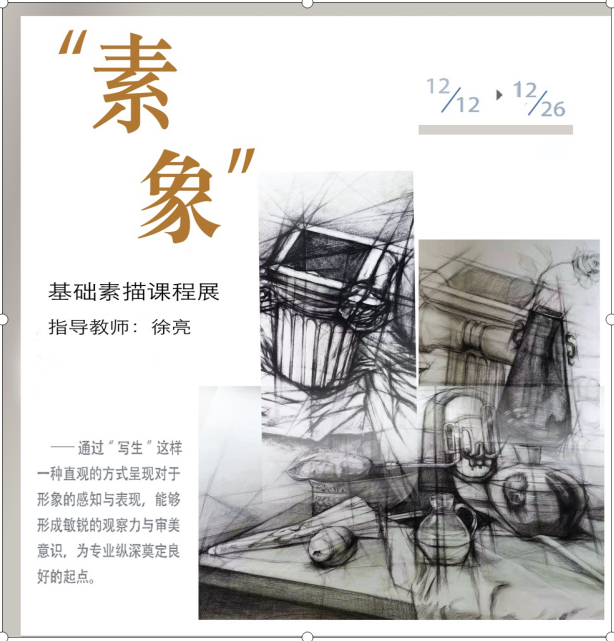 2020年12月12-26日,题名为“素象”的课程联展在雷竞技raybet官网入口一楼展厅开展,集中展示由徐亮老师指导的20级设计五班与20级研究生学科教学美术班的基础素描教学成果。
