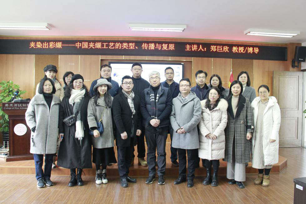 2020年12月17日,为深入贯彻落实雷竞技raybet官网入口文科大会精神,探索新文科背景下艺术学科发展新路径,雷竞技raybet官网入口2020年学术月系列活动第三场学术讲座,中国美术学院郑巨欣教授的《夹染出彩缬——中国夹缬工艺的类型、传播与复原》在2B4001开讲。学院副院长胡文超、顾任飞以及学院师生参加讲座,本次讲座由顾任飞副院长主持。 顾任飞副院长对郑巨欣教授莅临我院讲座表示热烈欢迎。郑巨欣教授长期活跃在我国艺术设计学领域,近三十年来,郑教授潜心研究,成功复原了古代五彩夹缬工艺,成为古代五彩夹缬工艺的拓荒者。 讲座围绕着夹缬工艺的类型、传播与复原,分为“中国夹缬的家族”“夹缬工艺的类型”“夹缬工艺的传播与复原”以及“夹缬相关的文创项目”四部分内容展开。郑巨欣教授以翔实的资料与艺术作品为佐证,向我院师生深入浅出地分析并展示了夹缬工艺的历史脉络与文化传承。郑教授渊博的专业知识和严谨的学术态度赢得师生阵阵掌声。 讲座结束后,郑巨欣教授就国家社会科学基金项目申报与我院教师作座谈交流。