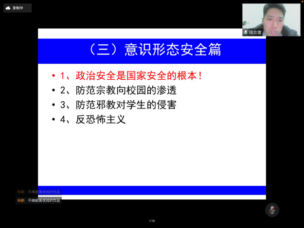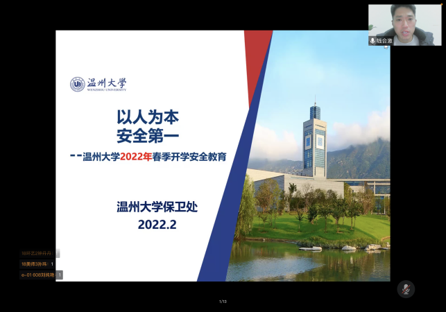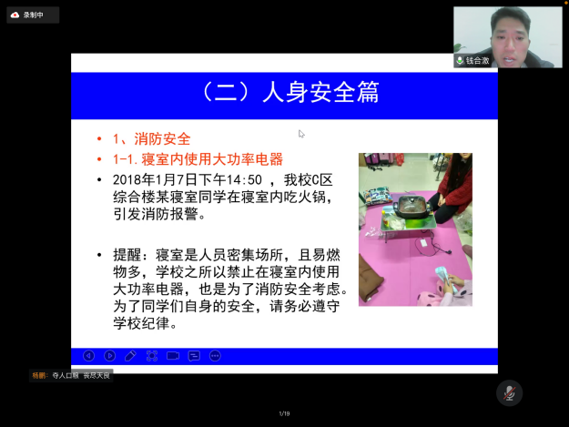2022年2月23日晚上,在新学期,学院组织形势政策报告会——雷竞技raybet官网入口2022年春季开学第一课暨安全教育专题讲座在腾讯会议上进行。本次报告会的主讲嘉宾雷竞技raybet官网入口保卫处副处长钱合激老师,参加此次报告会讲座的有学院全体辅导员以及全院所有本研同学。学院学工办主任杨鹏老师主持了报告会讲座,介绍了本次报告会讲座的重要性以及的听课纪律。