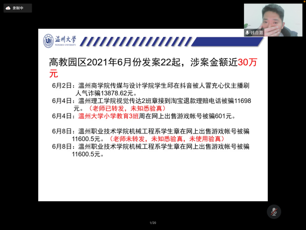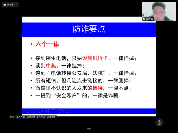 首先,钱合激老师指出大学生常见的安全问题主要分为财产安全、人身安全、意识形态安全、反诈防诈、寝室消防安全、宗教知识教育等,共同建设和谐美好的平安校园需要全体同学的努力。钱老师结合最近雷竞技raybet官网入口城内相关诈骗案件的最新情况,警示我们诈骗离我们并不遥远,除了电话诈骗和网络兼职诈骗,还要防范钓鱼网站的诱惑,提高警惕,防诈反诈。同时,他也向同学们介绍了网络诈骗的特点,常见的电信诈骗手段,讲解防诈骗常识,引导学生树立正确的消费观以及在生活中如何防止被套路贷等知识。钱老师通过经典案例、相关反诈宣传视频、图片,列举了电信网络诈骗犯罪的几种常见形式,有针对性地向同学们阐述了如何识别防范电信网络诈骗及上当后的补救措施,并号召同学们:电信网络与我们息息相关,我们要强化系统观念与法治思维,提升防范和辨别诈骗的能力和水平,推动建设更高水平的平安校园。