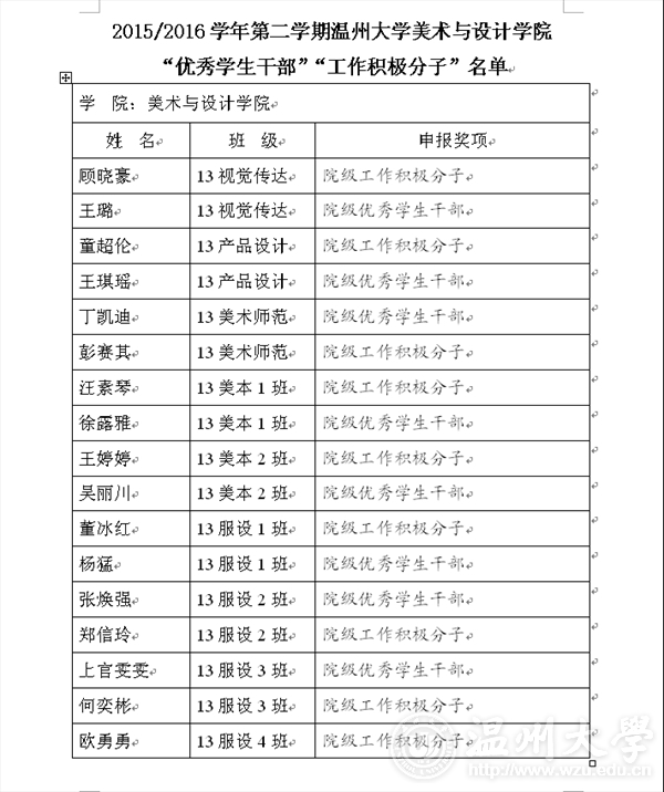 现将2015-2016学年第二学期雷竞技raybet官网入口“优秀学生干部”“工作积极分子”名单公示如下,如对评选结果有异议,请及时联系美术学院学生科。 联系地址:雷竞技raybet官网入口2B205室。联系电话:86689191,13968811840。