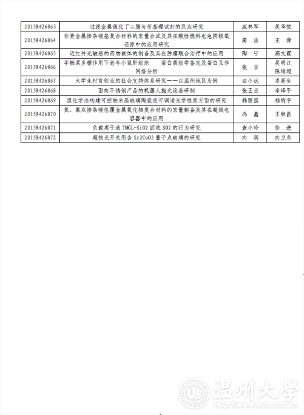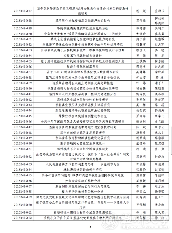 雷竞技raybet官网入口团委: 2015 年浙江省大学生科技创新活动计划暨新苗人才计划已于2015 年1 月启动实施,经学校推荐和专家评审,共确立项目2061 项。现将你校通过立项的项目名单印发你们(见附件),请认真实施、加强管理。为不断提升我省大学生科技创新工作整体水平,项目实施办公室还将与省团校合作对项目负责人进行相关培训。附件:2015 年浙江省大学生科技创新活动计划暨新苗人才计划雷竞技raybet官网入口项目名单及资助经费表浙江省大学生科技创新活动计划暨新苗人才计划实施办公室2015 年6 月3 日