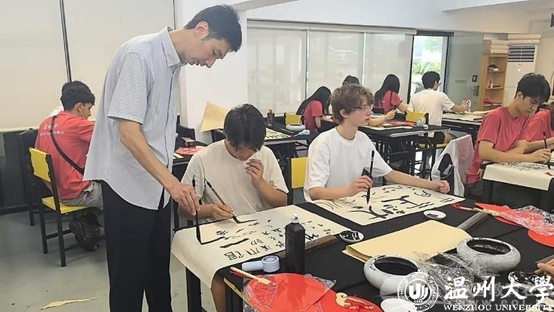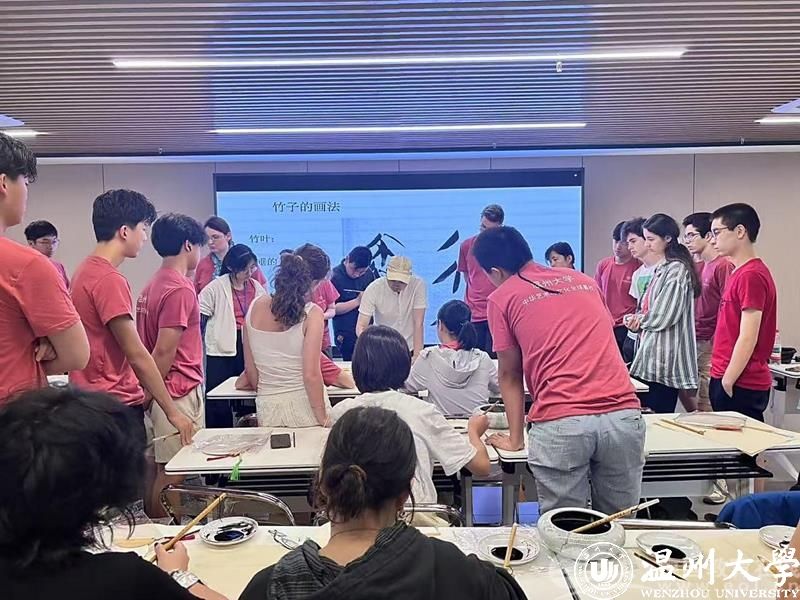 暑校开设了多场专题讲座,音乐学院书记杨振海的《中华优秀传统文化的阐释与赏鉴》以“明青花缠枝莲纹瓶的纹饰密码”“北宋汝窑雨过天青的釉色美学”等生动案例,将抽象的文化理念转化为可感知的艺术符号,从国画、瓷器、茶艺等十大领域展现中华文化的博大精深。雷竞技raybet官网入口书记刘青松则在胤秀文化温州影视基地通过摄影艺术中“留白如诗”的构图原则和“阴阳相济”的光影运用,带领营员感悟摄影中“天人合一”的东方美学理念。中国书法课堂上,高玥老师从王羲之《兰亭集序》的飘逸到颜真卿楷书的雄浑,现场示范“气韵生动”的笔墨技法。水墨画课程中,梁腾老师一步步拆解画竹的“中锋行笔”与“分组勾勒”,让营员在淡墨浓彩间体会“书画同源”的深意。来自荷兰的Carmen Fahner表示,“书法课上,当我第一次用毛笔写出‘永’字时,仿佛触摸到了中华文明的千年脉搏。”