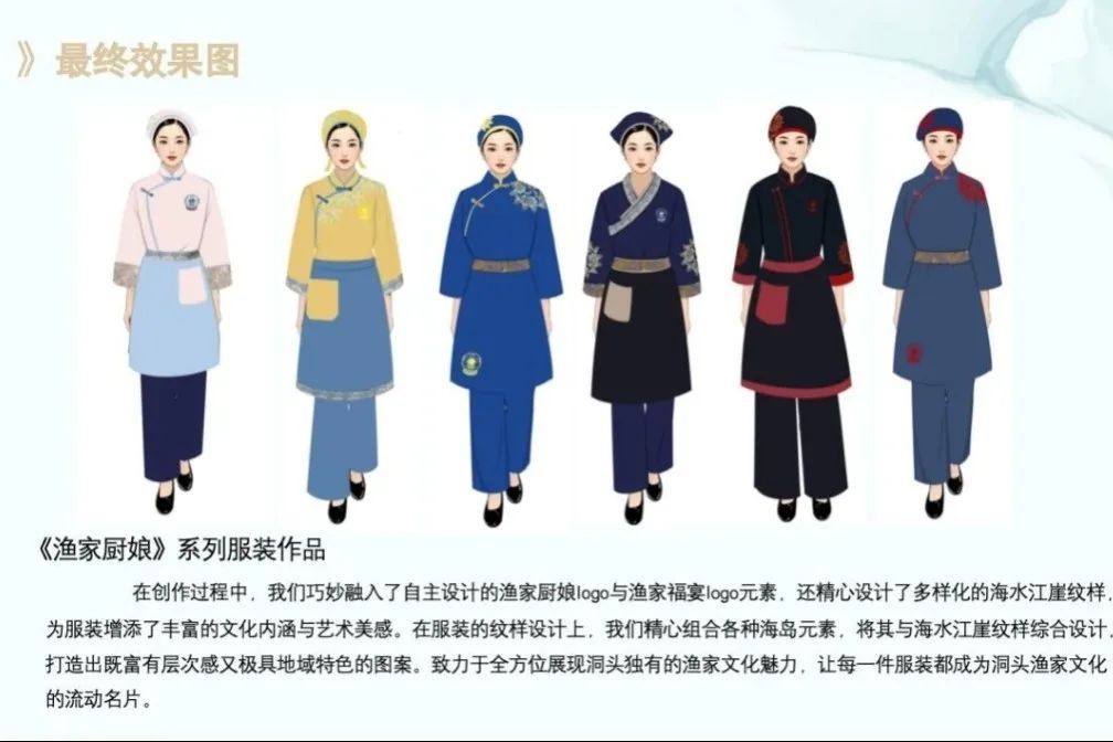 为洞头厨娘量身定制系列服装与IP形象时,金晨怡教授一头扎进洞头田野调研,深度挖掘其文化价值与艺术魅力,而后以精妙绝伦的设计手法,将这些独特的海洋文化元素巧妙融入服装设计之中。从色彩的细致选取,到图案的精巧构思;从面料质感的严苛考量,到款式细节的精雕细琢,每一处设计细节都流淌着洞头独有的文化韵味,同时又巧妙融合现代时尚感。这些匠心独运的设计,不仅为洞头厨娘塑造了全新的形象,更成为推动当地乡村文化建设与经济发展的强劲引擎,全方位提升了乡村的文化软实力与品牌影响力。
