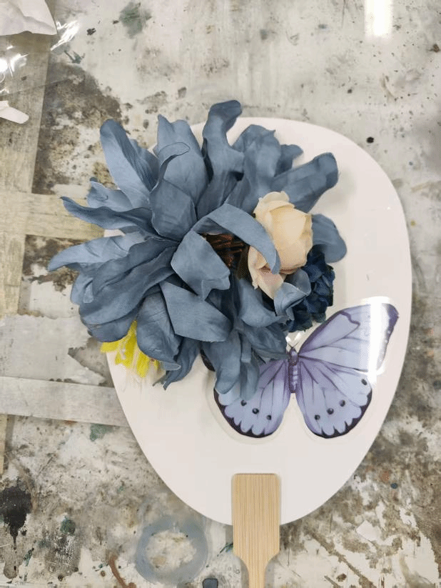 活动正式开始,教室里瞬间充满了专注而愉悦的氛围。大家纷纷挑选好心仪的素面团扇和各种材料,迫不及待地开始了自己的创作。有的同学选择用干花进行装饰,他们小心翼翼地用镊子夹起花瓣和叶片,在扇面上比划、构图,再用特制胶水轻轻粘贴,打造出立体的花语意境。另一边的画者们则沉心静气,手持画笔蘸取颜料,或勾勒写意山水,或描绘精致花鸟,笔尖游走间,空白的扇面逐渐被绚丽的色彩和生动的意象填满。每个人都沉浸在这方寸之间的艺术世界里。